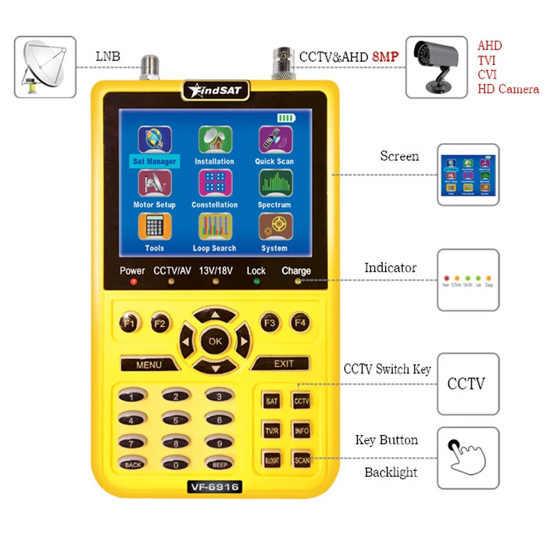 VF-6916 Satellite Finder Für Satellite TV Receiver DVB S2 CCTV AHD & TVI & CVI HD Kamera Display Sat finder h.264.