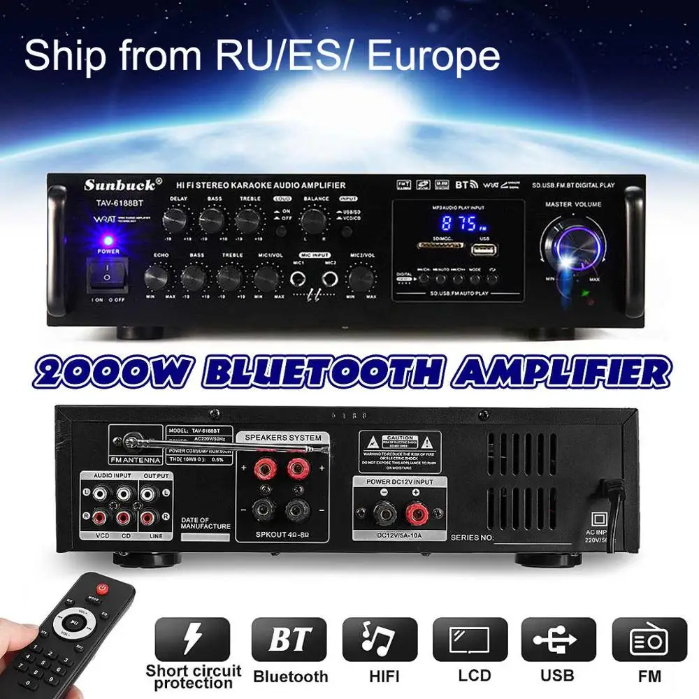Rabatt Leistungsstarke 2000W 110V 220V bluetooth 4ohm Stereo Audio Power HiFi Verstärker Karaoke Verstärker + RC Unterstützung 2 MIC FM Power Verstärker